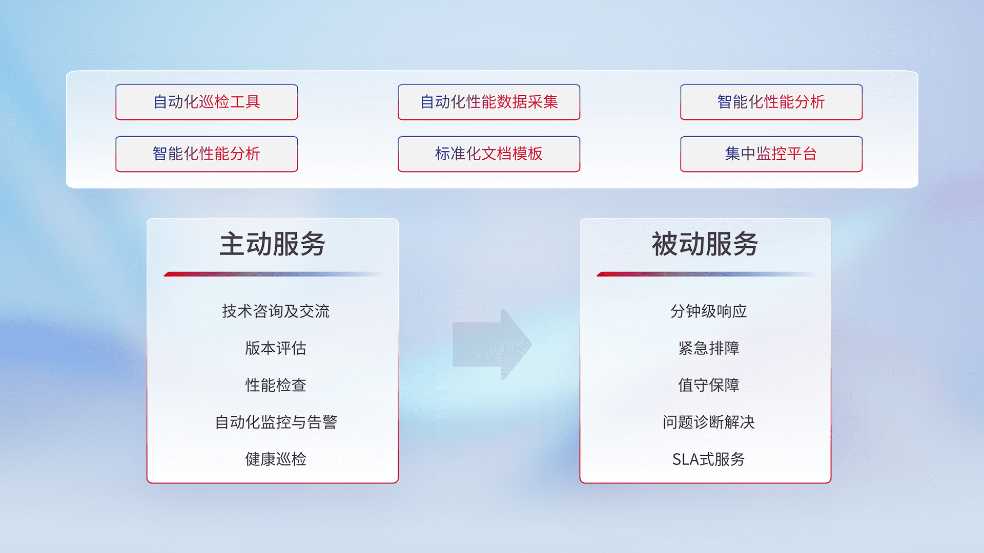 智能化工具和标准化文档,,,,保障服务质量,,,,提供主动服务(包含技术咨询、、、版本评估、、、性能检查、、、、自动化监控与告警、、健康巡检)和被动服务包含(分钟级响应、、、、紧急排障、、值守保障、、问题诊断解决、、SLA服务)。。。。