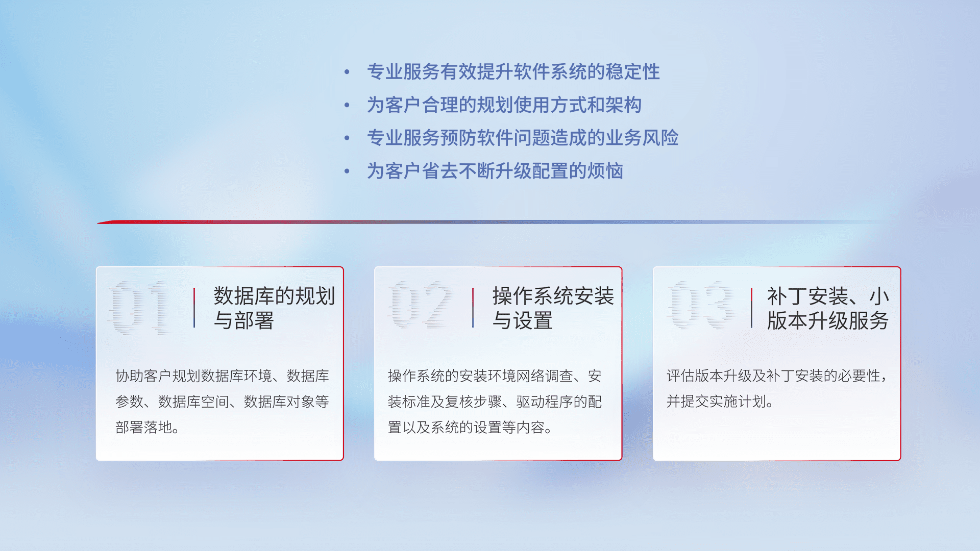 为客户提供软件规模升级、、、、快速部署、、、按需配置的专业服务,,从数据库的规划与部署到操作系统的安装与设置,,再到补丁安装和小版本升级提供支持。。